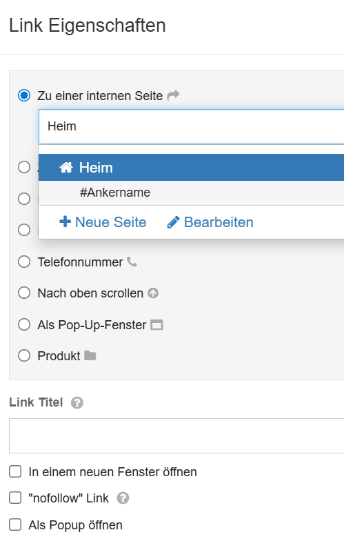Wählen Sie dann "interne Verlinkung" aus, dann den entsprechenden Ankername, z. B. #kontakt.