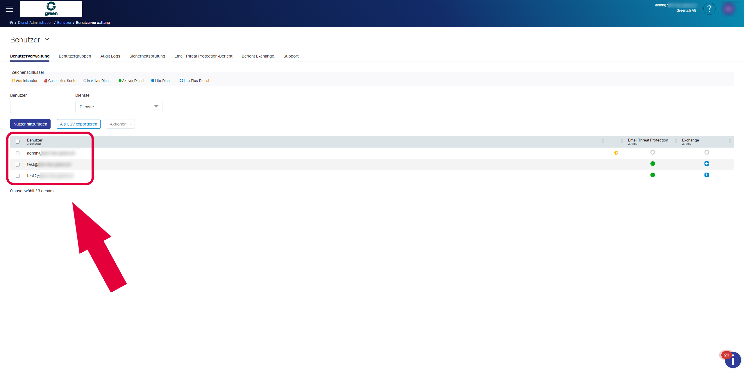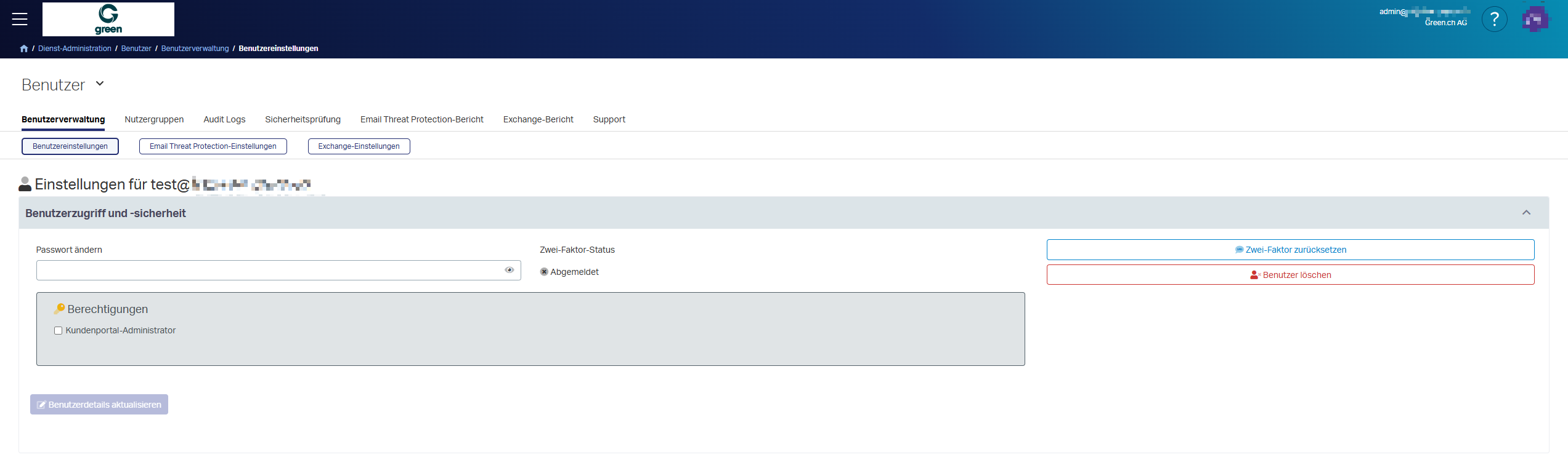 Melden Sie sich unter green.edgepilot.com mit Ihrem Admin-Benutzer (z.B 'admin@green-beispiel-domain.ch') an.
