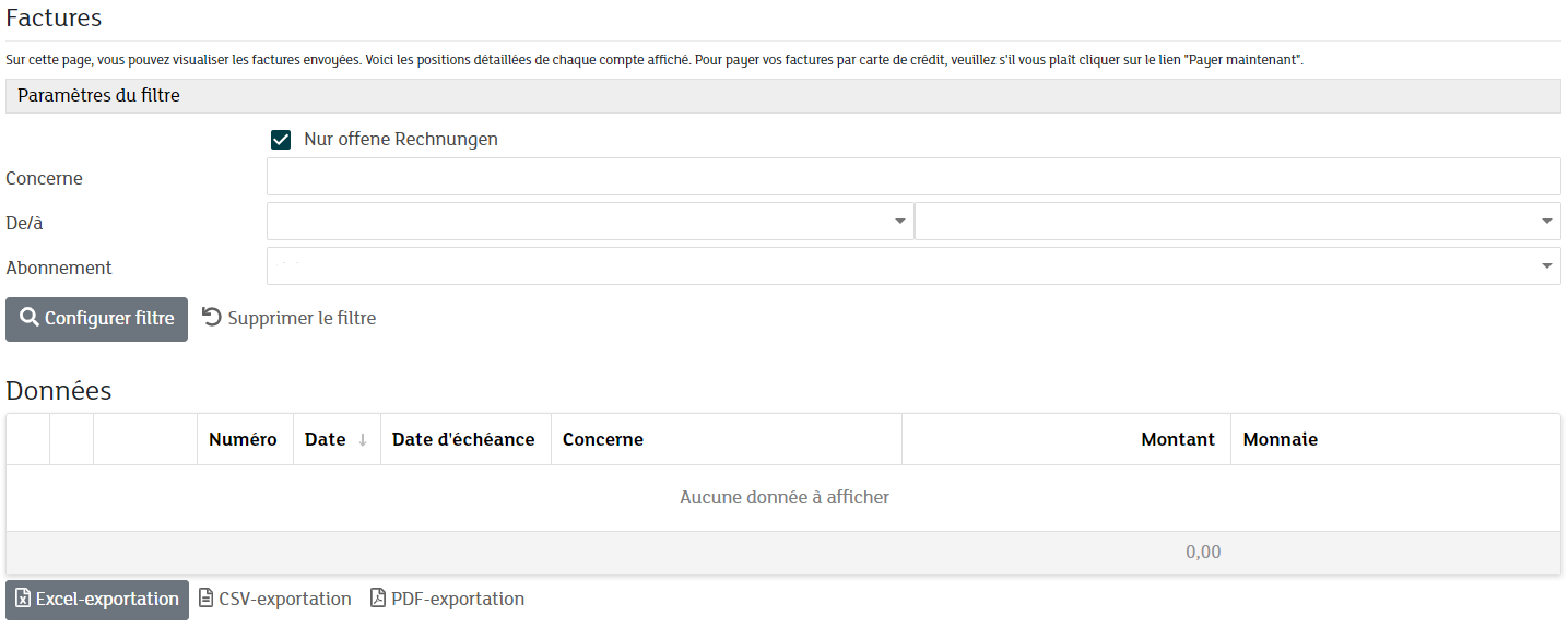 Vos factures ouvertes et déjà payées sont affichées ici. À l'aide du filtre, les factures peuvent être triées par sujet, abonnement et date.