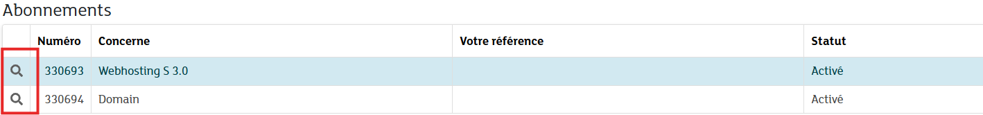 Dans la ligne correspondante, cliquez sur l'icône de la loupe située tout à gauche (juste à côté du numéro d'abonnement) pour sélectionner l'abonnement que vous souhaitez résilier