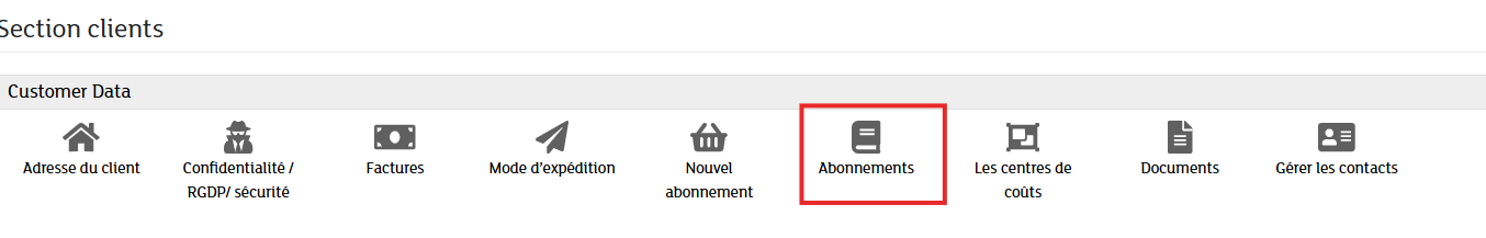 Une fois connecté avec succès au portail client my.green.ch, cliquez sur « Abonnements » (Abonnemente verwalten) dans l'espace client, sous la rubrique « Données clients »