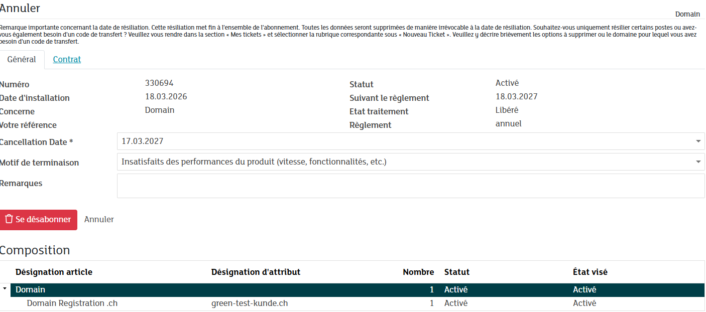 Dans la vue détaillée de votre abonnement, cliquez sur le bouton rouge « Se désabonner» (Une nouvelle fenêtre s'ouvre alors, vous permettant de définir la date de la résiliation :